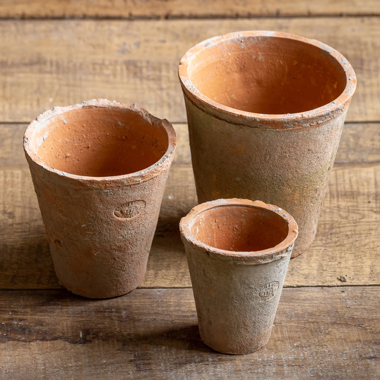 A nesting set of handmade terracotta pots with a mossy appearance to look like theyβve been in the garden forever. Lovely grouped together on your outside table or some stone steps.