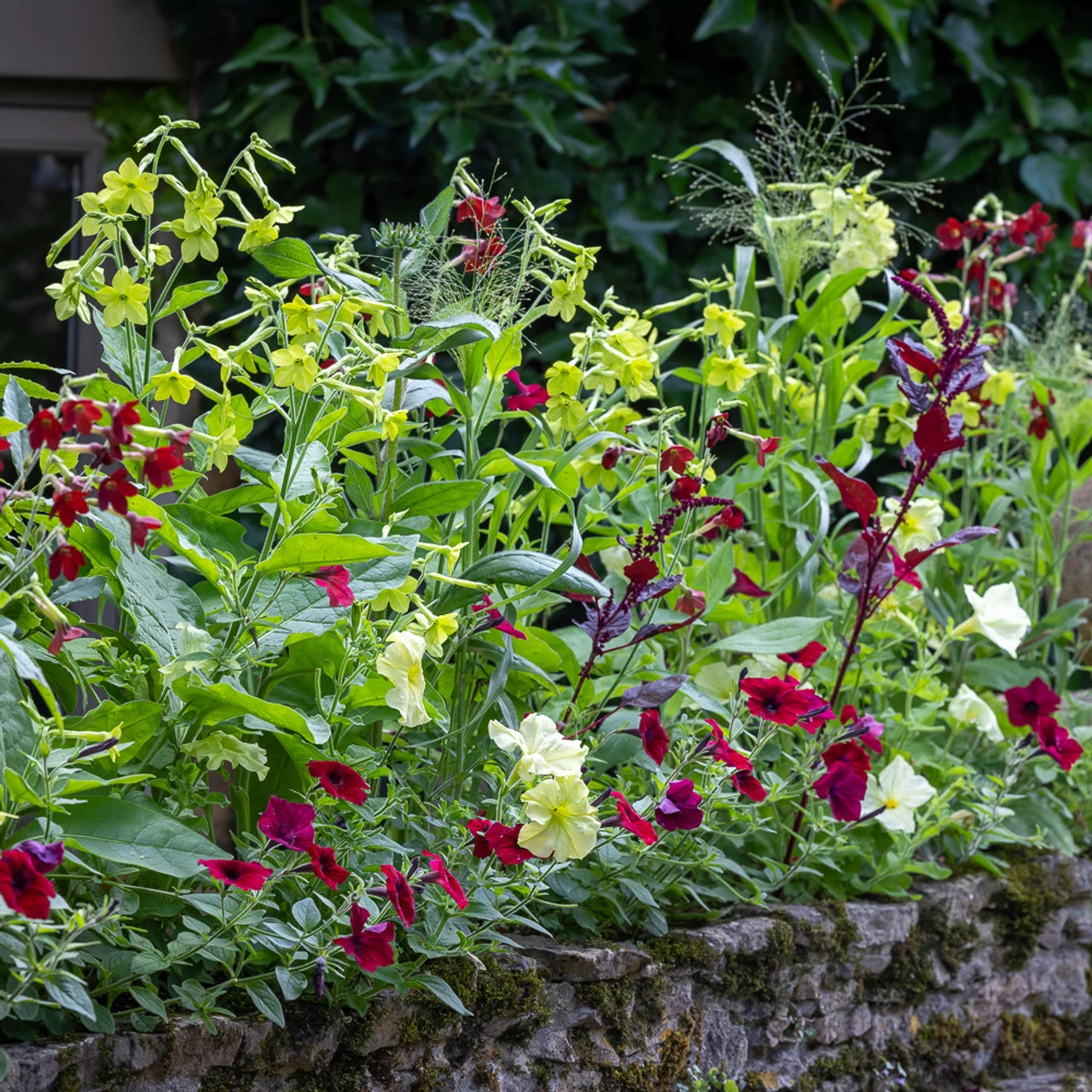 Genius collection of glamour — with velvet textures and colours which will thrive in sun or dappled shade. Planted in the hollow top of a wall in Arthur’s Gloucestershire garden, this looked incredible for months on end and was there to pick for vases too.