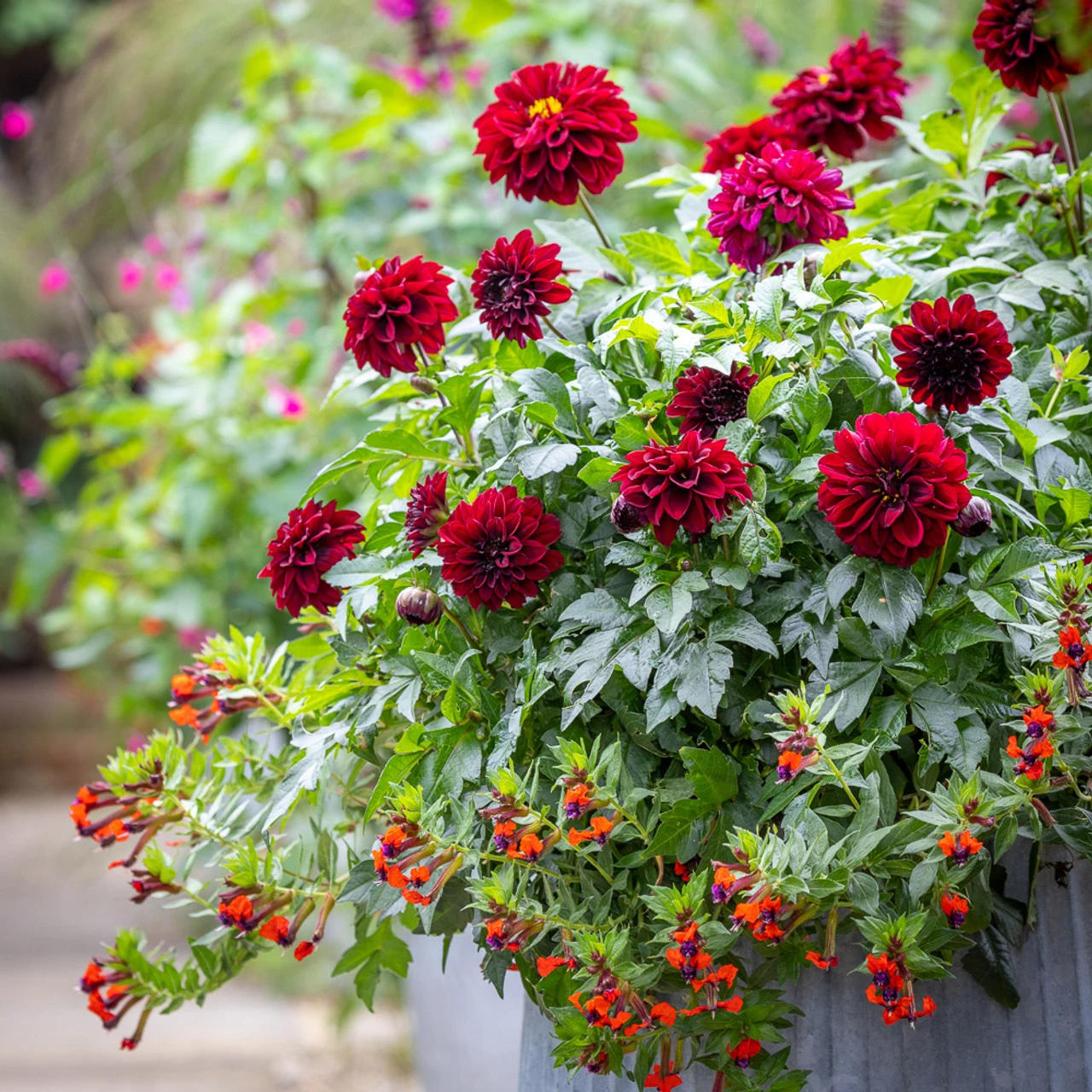 This compact but not uptight dahlia is one of my new-found favourites for adding rich colour and texture to our pots β here by our Chelsea shed. Itβs all the better for the ruff of cuphea in purple and red spilling out below it.