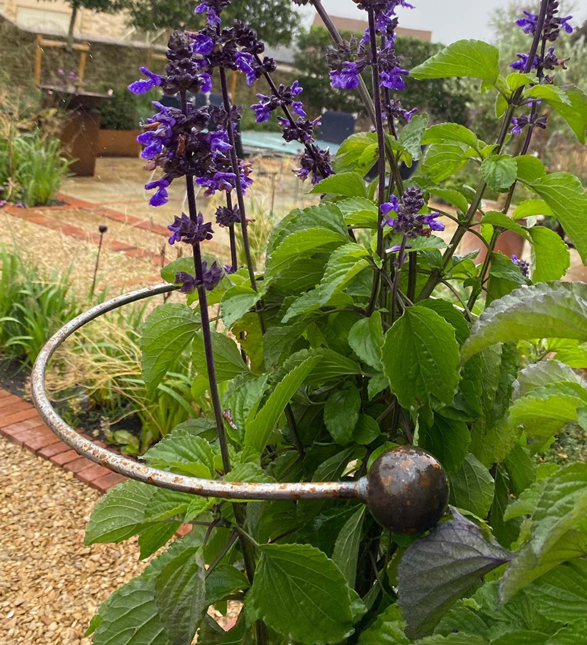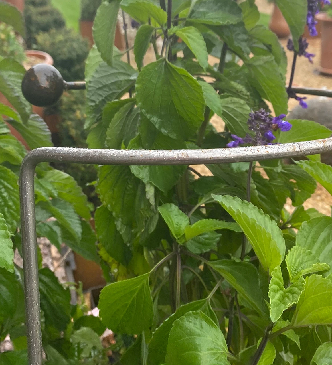 This sturdy steel support props up plants on all sides and is very good for dahlias. The top is not quite a full circle; there’s a gap for you to slide it round already-grown plants.