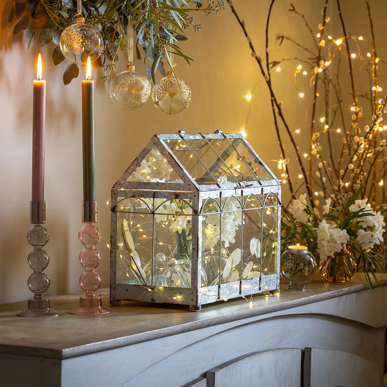 This real mini greenhouse makes a fantastic table centre filled with wire lights, Paperwhites and honesty seedpods, as pictured, or with seedlings growing away.