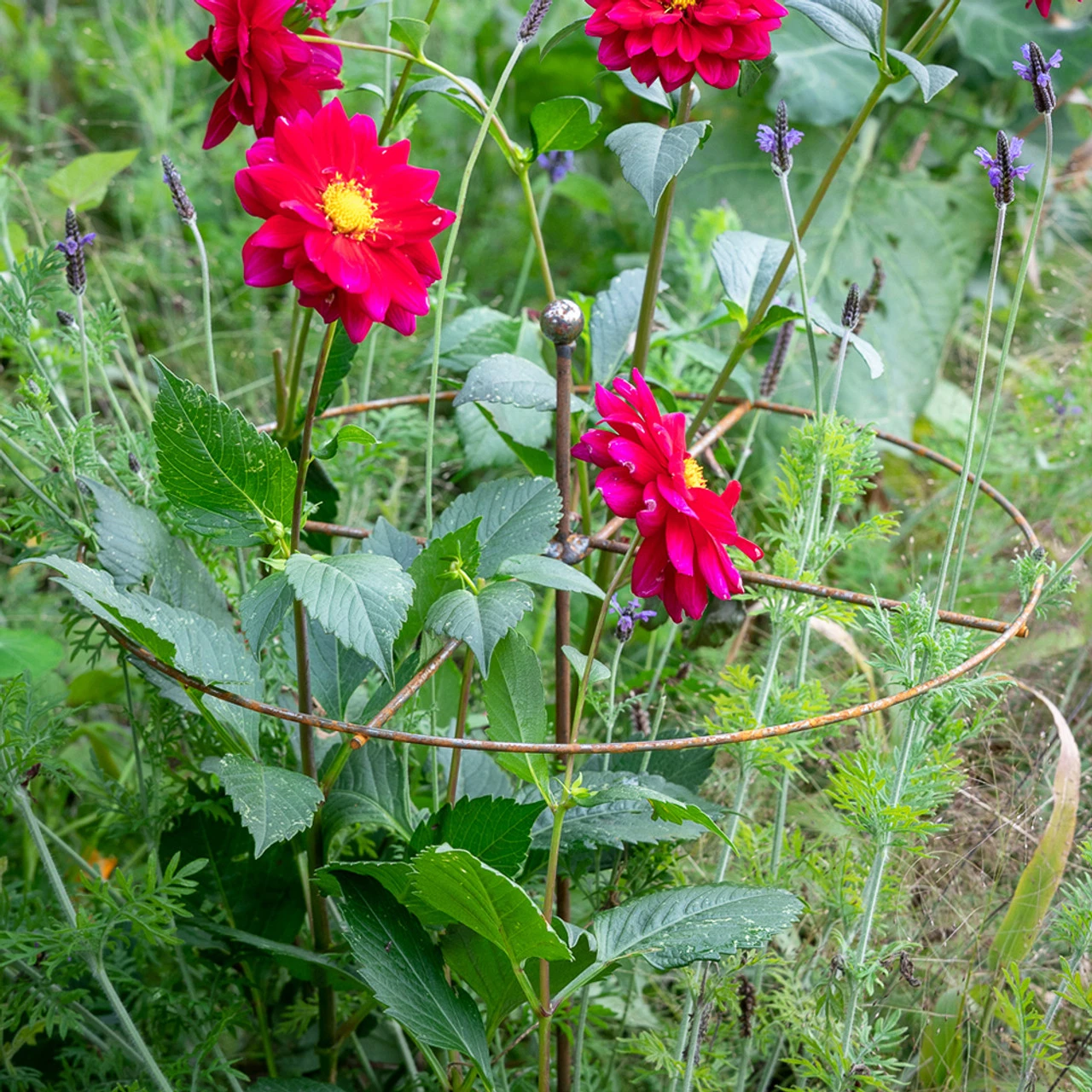 An Agriframes plant support. A single stake with circular divided ring on top. This is an excellent support for dahlias.