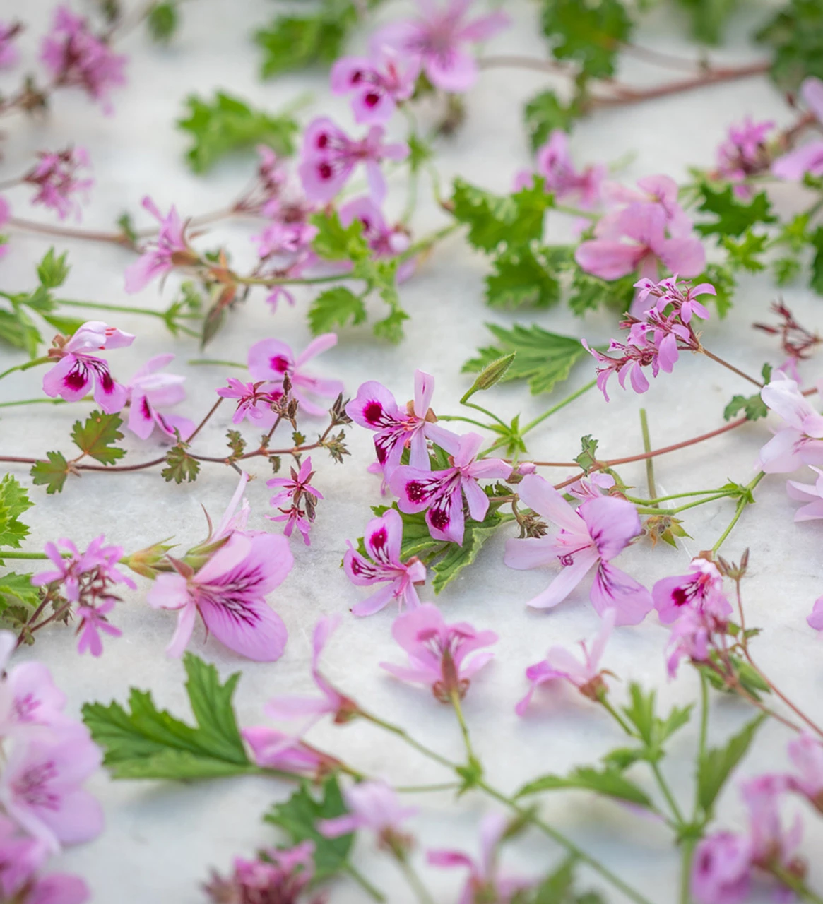 The prettiest combination of fine, elegant pelargoniums with delicious scented leaves. I have this trio by my kitchen door. Use the edible flowers of scented-leaved pelargoniums to decorate puddings and cakes and harvest the leaves to use as flavourings for cordials.