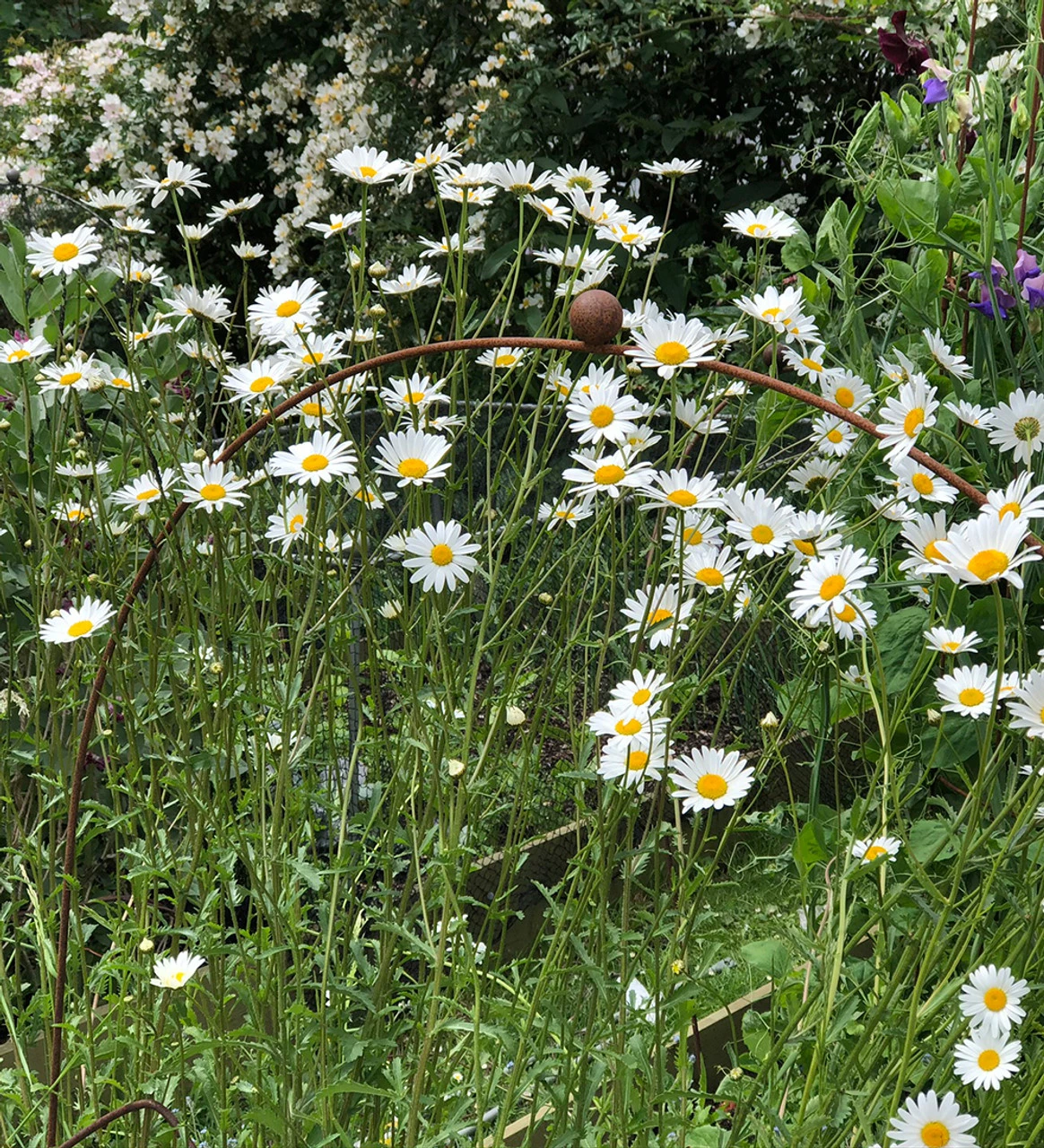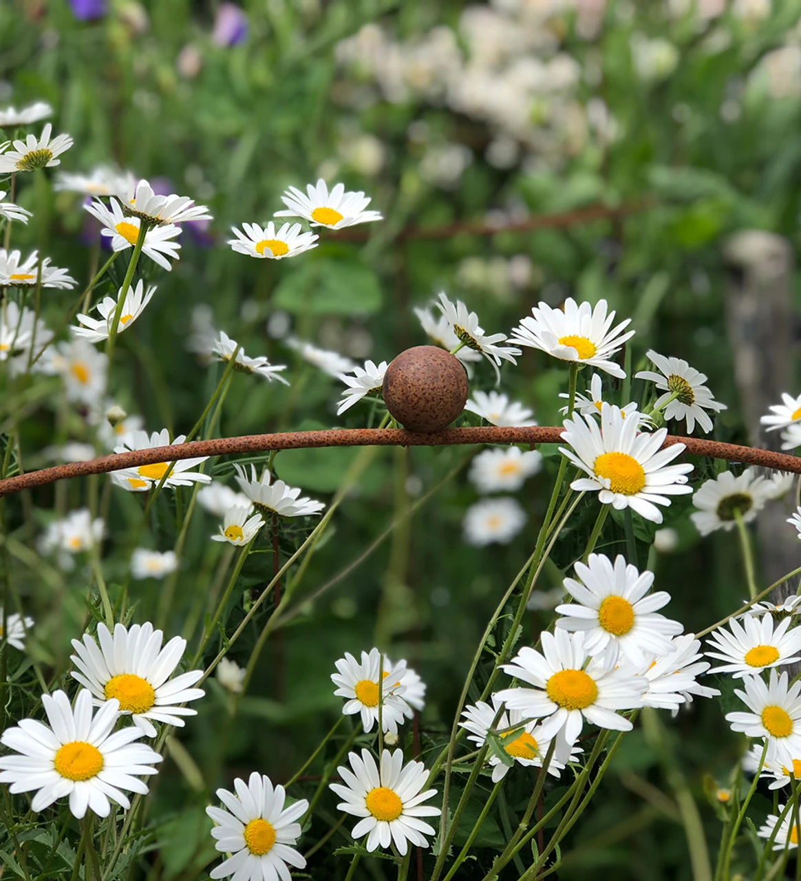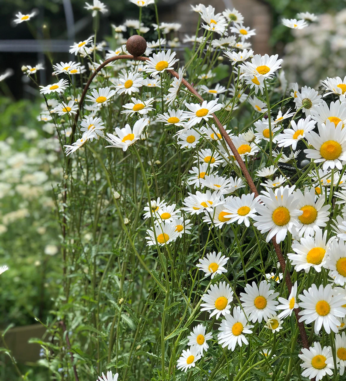 An Agriframes plant support. Versatile solid steel hoop with a vintage rust finish and simple ball finial. Use in groups with netting or fleece to create a stylish tunnel cloche or as singles for support in the border.