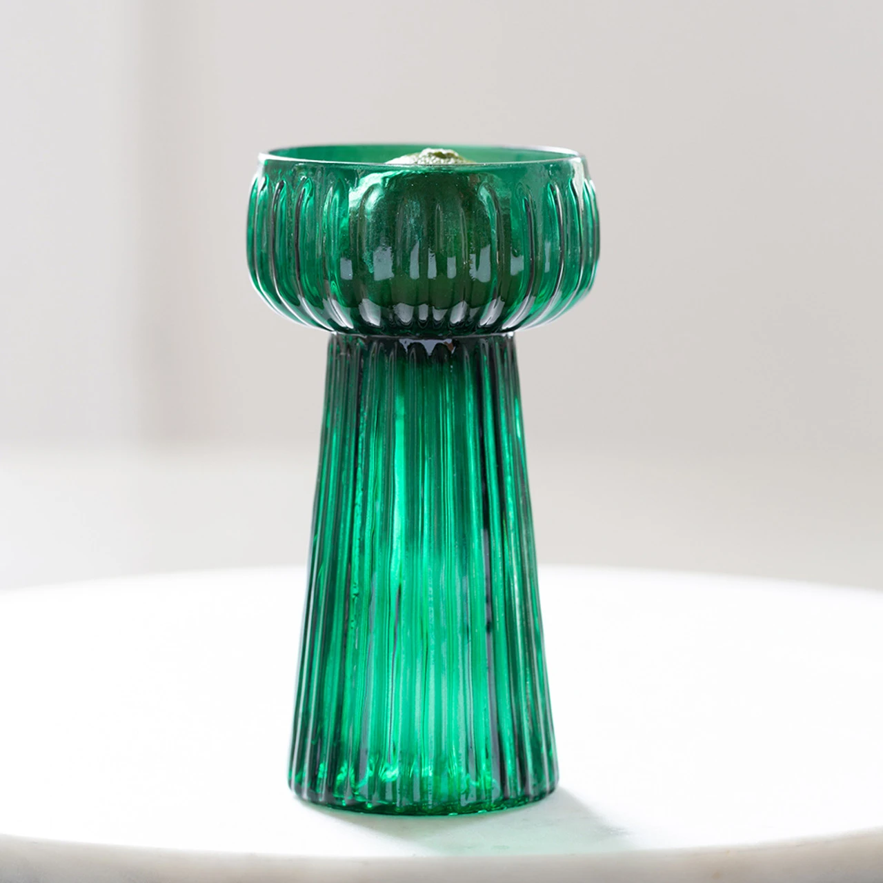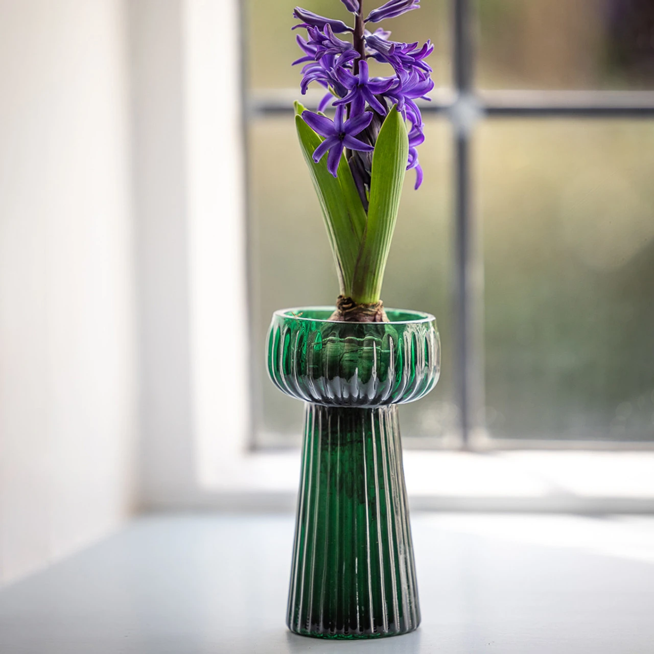 A beautiful hyacinth vase in a deep emerald green colour. The glass has a ribbed finish and although made with hyacinth bulbs in mind, it is equally perfect to hold a single stem.