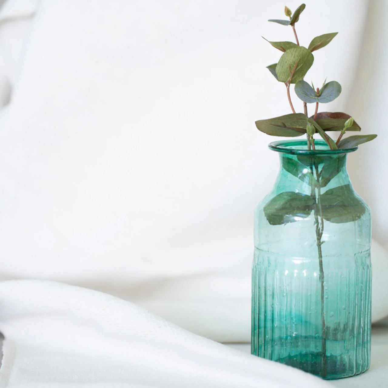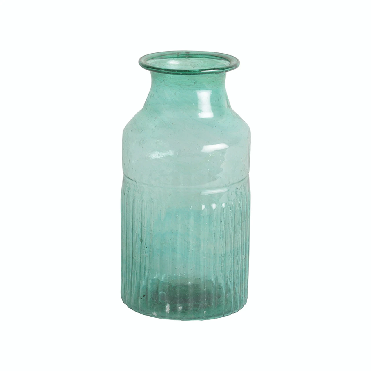 This recycled glass vase is pretty with a few stems alone, or grouped with others down a summer table.