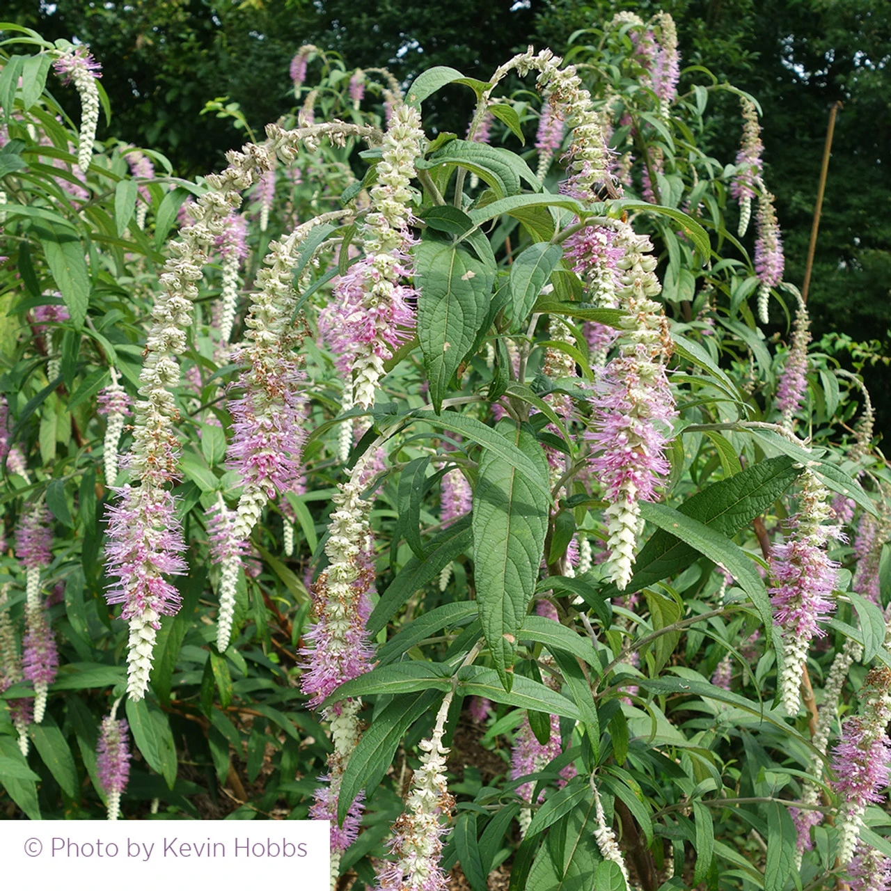 Very unusual and reliably hardy, with its pale lilac pink whiskers and tiny spiked flowers, this plant bears a striking resemblance to buddleia, and similarly is loved by pollinators of all kinds. We’ve come to really love it.