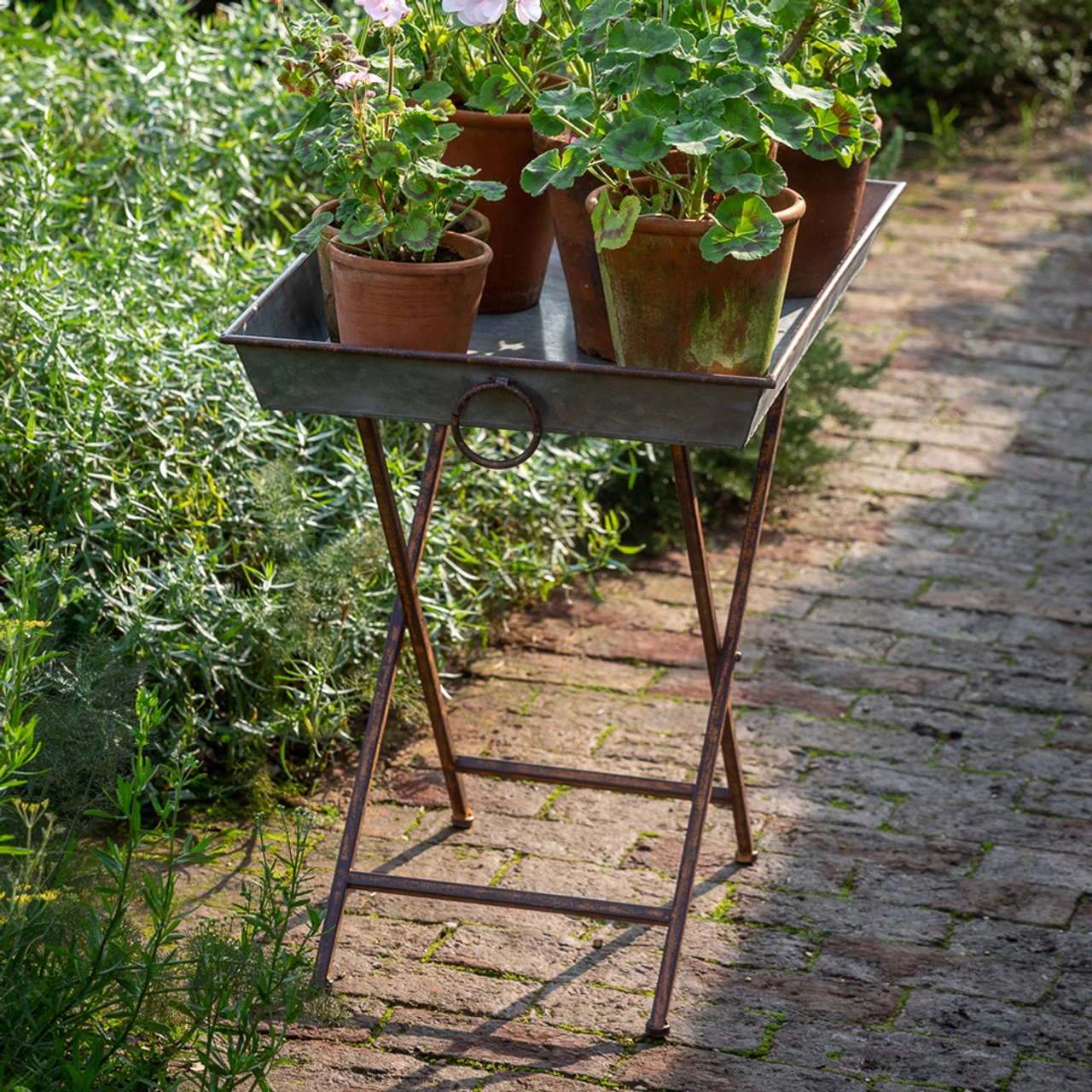 Made of zinc-coated steel with a rusted, aged appearance and folding legs for storage. Use this rustic metal table for your pots in the conservatory or greenhouse. I LOVE mine.
