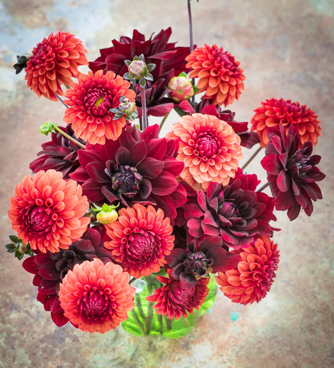 Two dahlias which contrast perfectly in shape and colour, both with unusually good vase lives. Growing together in the garden and picked and arranged, these were my favourite dark, rich duo last summer, and (staked) they grow well in containers too.