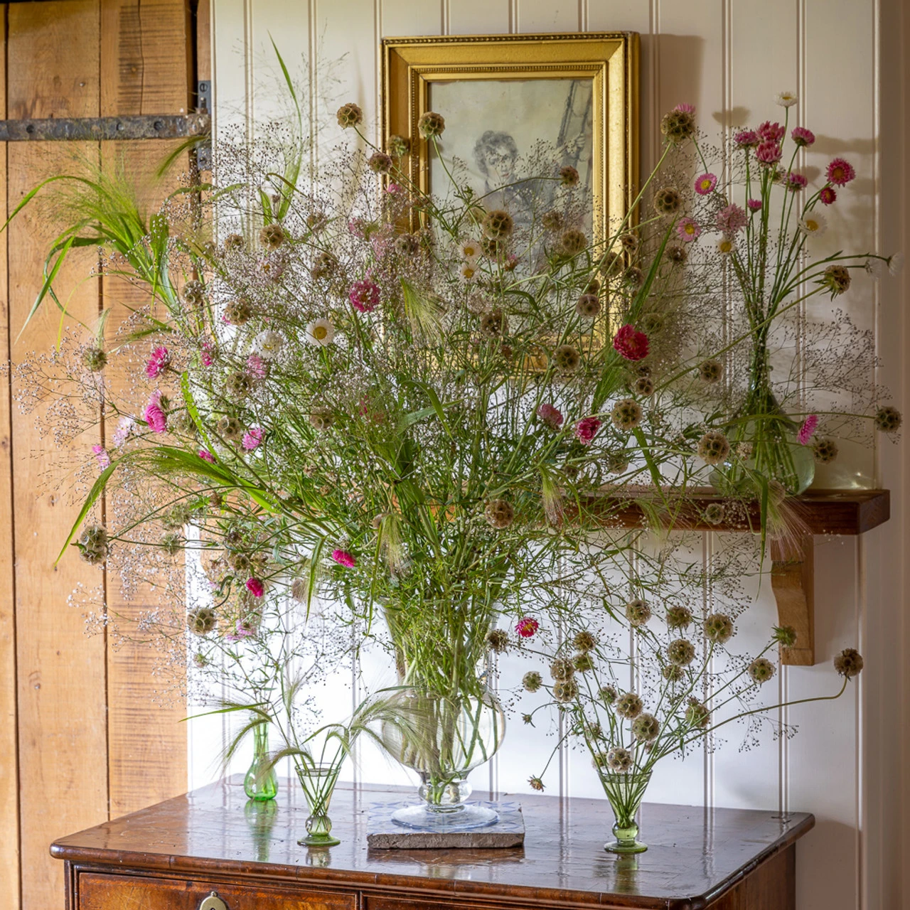 Like a puff of smoke, I love this light and airy mix of soft colours and haze-forming shapes, studded through with the starry seedheads of scabious and pink paper daisies. This looks wonderful fresh and just as good a month later, dried in the vase.
