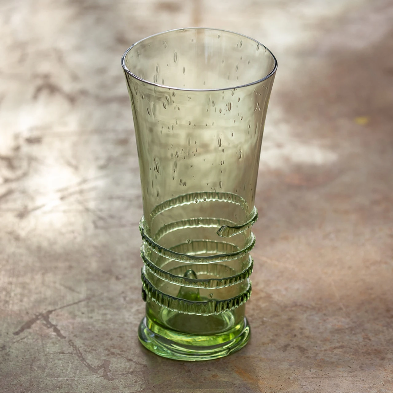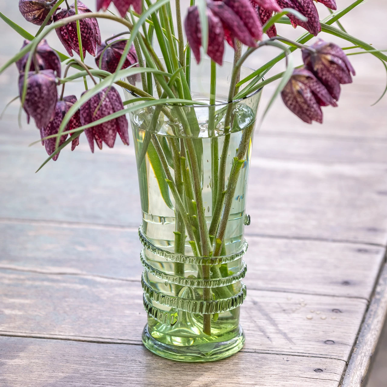 A tall, slim glass vase with interesting ribbed detail towards the base of the neck. Part of our Antique Style Vase range.