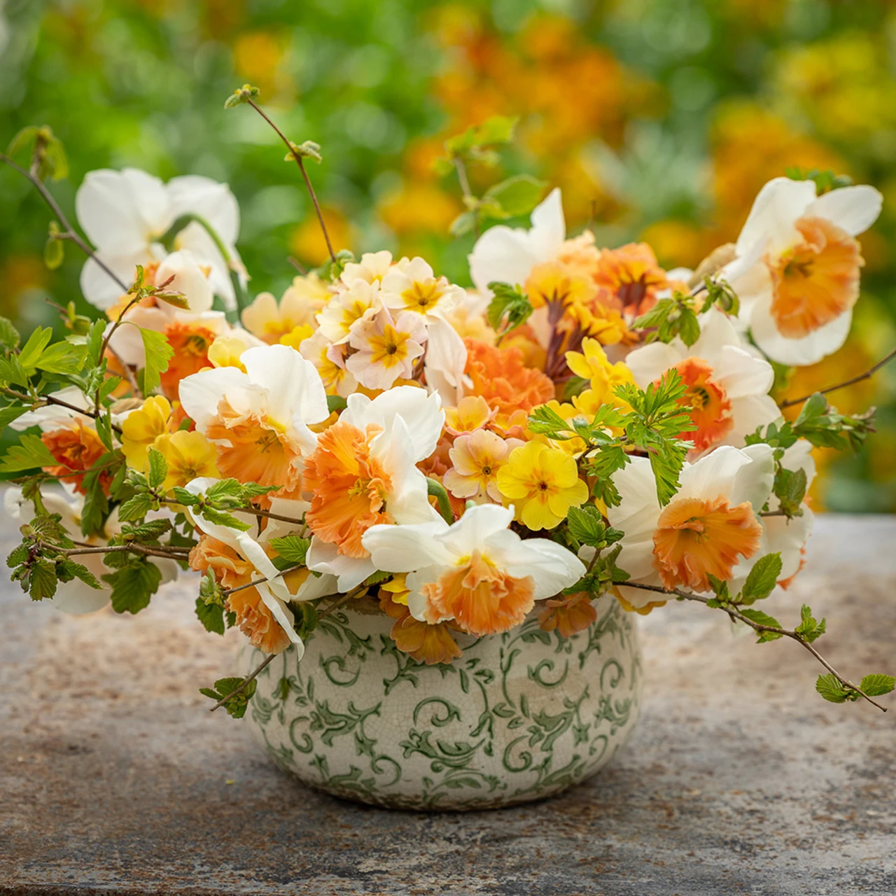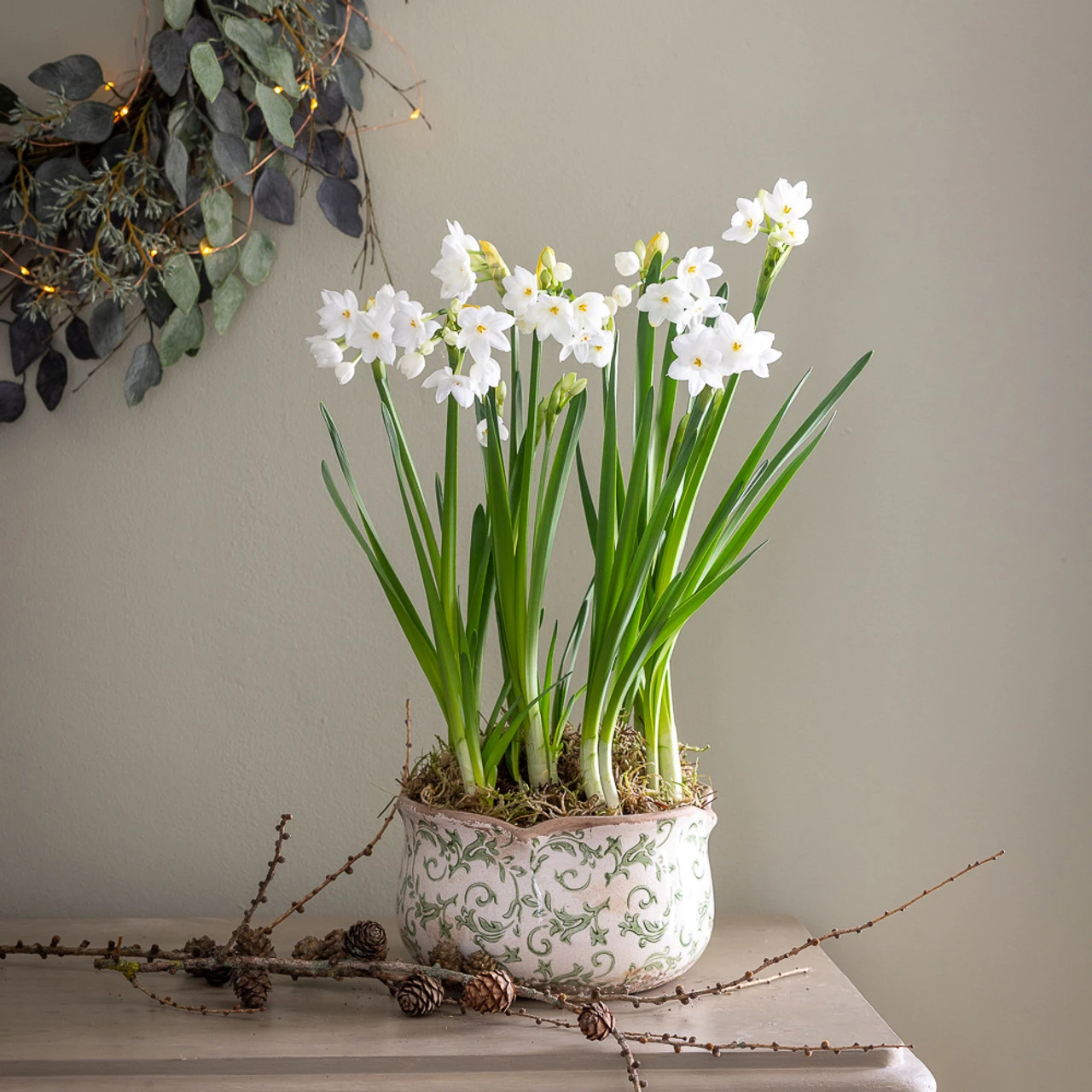 Lovely vintage-inspired bowls which are perfect for potting indoor bulbs. The wavy edged ceramic base has been crafted with a vintage style white ceramic and overlaid with a green floral design. As these products are hand finished, there might be slight variations in the finish.
